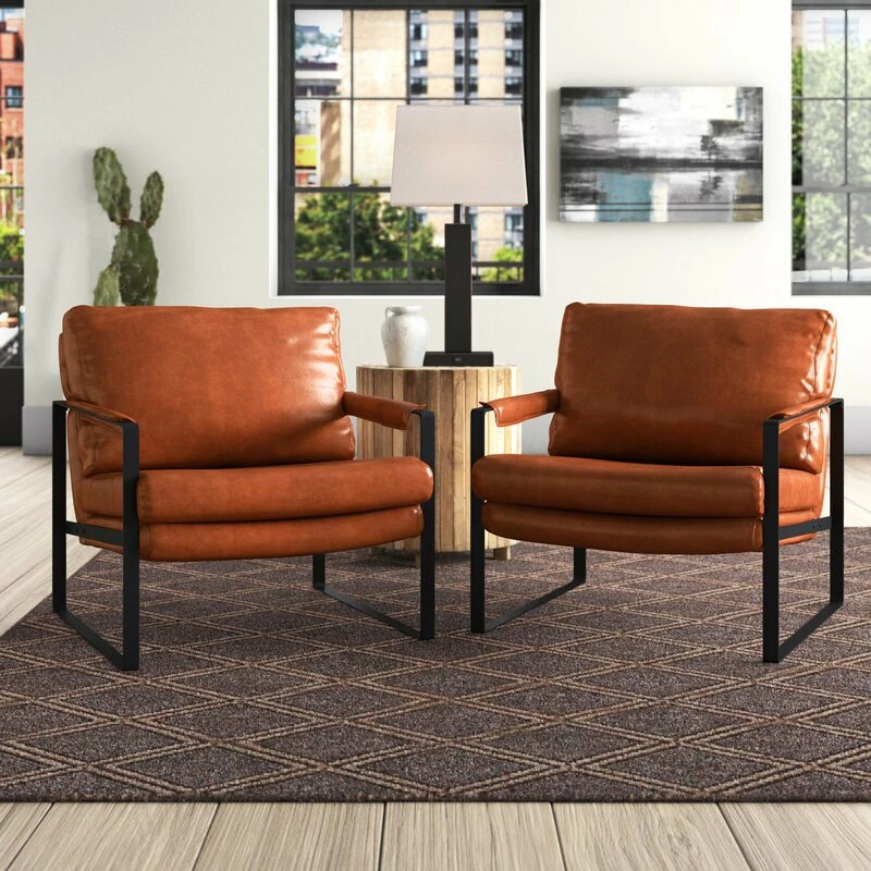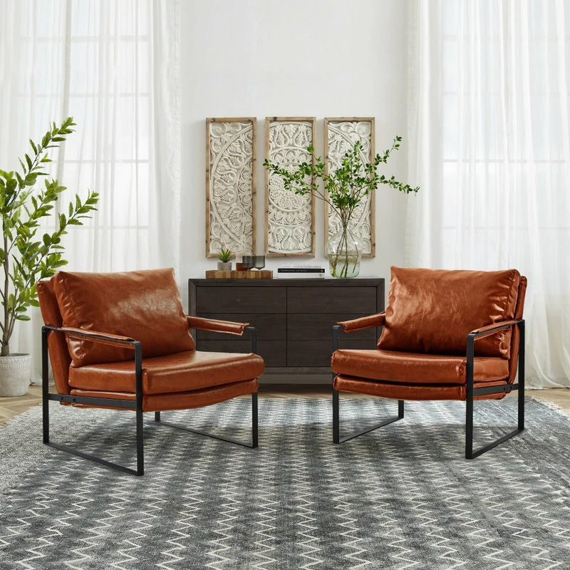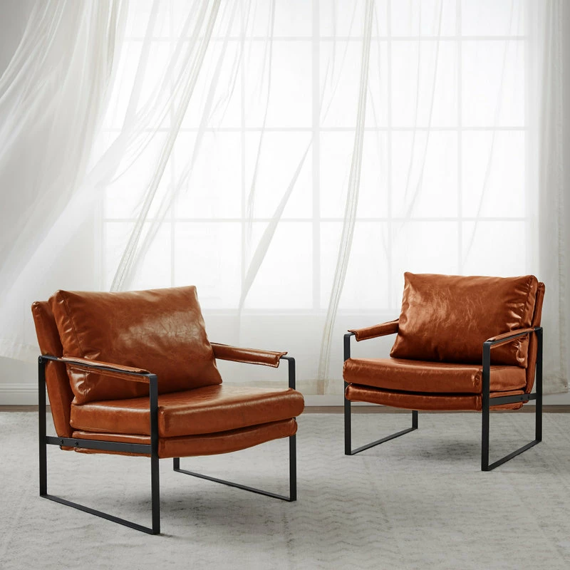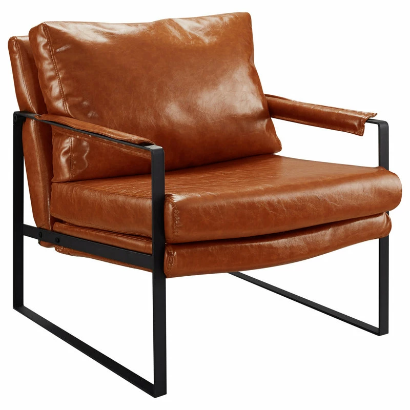 The Art-Leon modern accent armchair with an elegant design is a gorgeous addition to complement any lounge or living area. Crafted from a durable black metal frame with straight lines design, offering strong stability and long-lasting support. Upholstered in sophisticated faux leather with high-density foam padding adds a luxurious look, the cushion back and seat for extra comfort. Upgrade your leisure time with the glamor and luxury of this accent lounge armchair. Perfect for adding a contemporary spin on a mid-century modern living room.