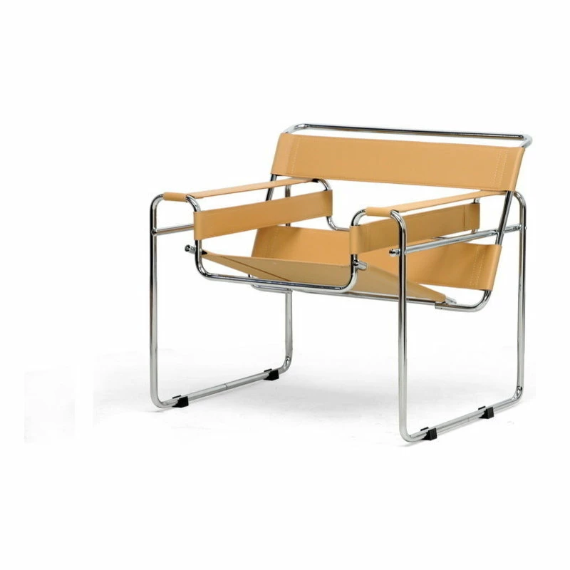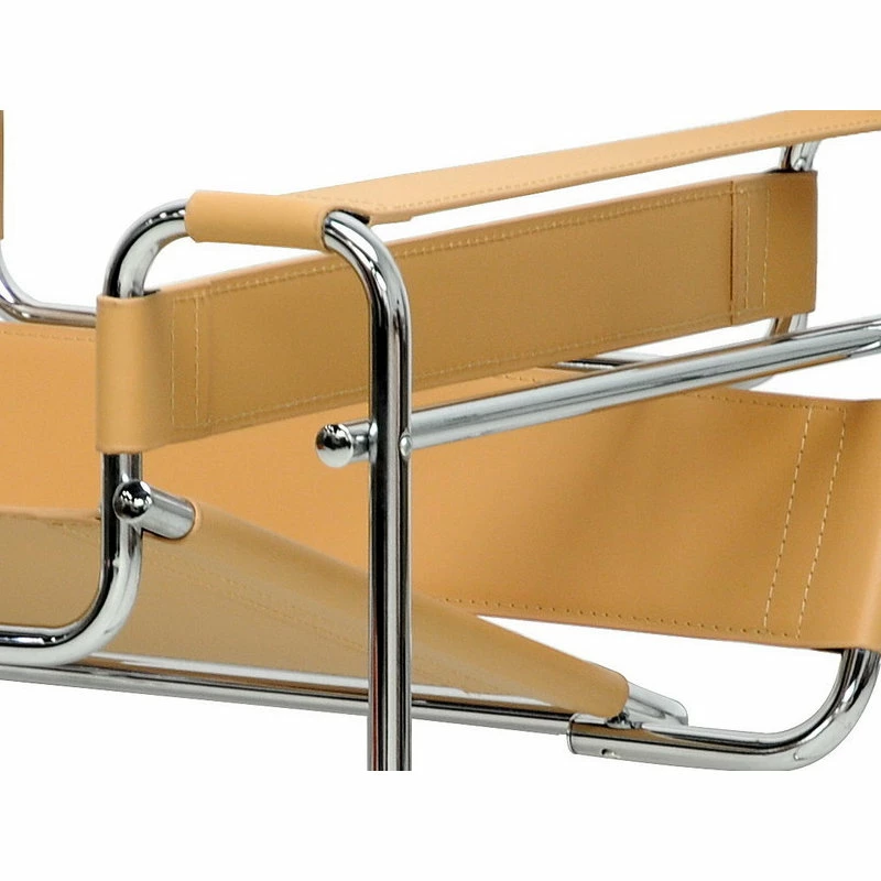 With a nod to the seemingly timeless creations of the mid-1900s, the Jericho Chair helps bring great taste and design back into your living room. This is a steel-framed mid-century accent chair with high-shine chrome finish and tightly-pulled, taut tan bonded leather straps with matching stitching. Black plastic non-marking feet are included to help prevent damage to sensitive flooring. Made in China; fully assembled. To clean, wipe with a dry or damp cloth. This style is also offered with black or dark brown leather (each sold separately).