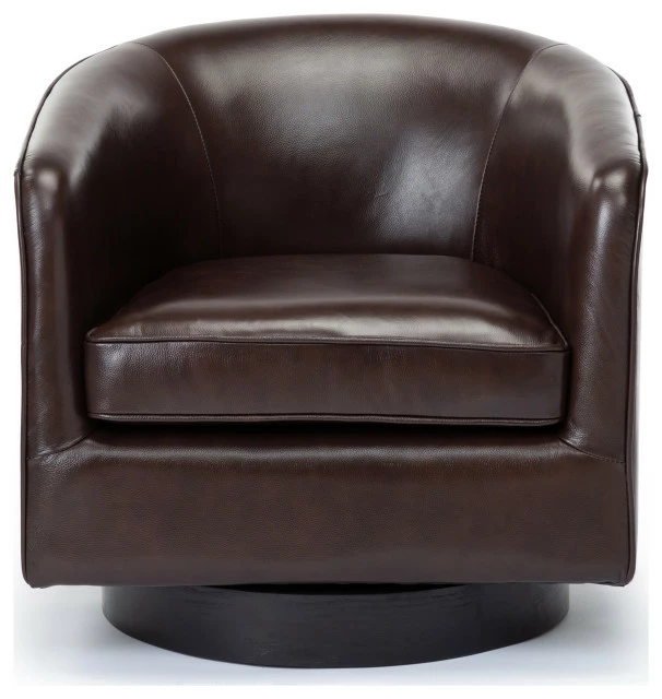 Simplified profile, soft curves, and top grain leather makes the Turner swivel chair perfect for any size room. The barrel design features pocket coil seat system for comfort all around.