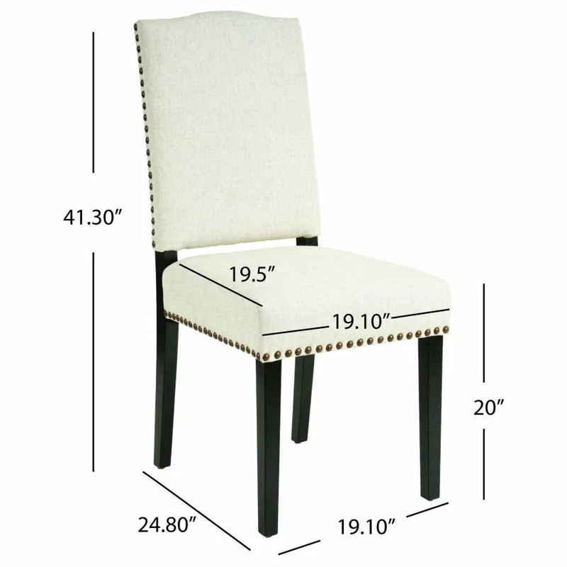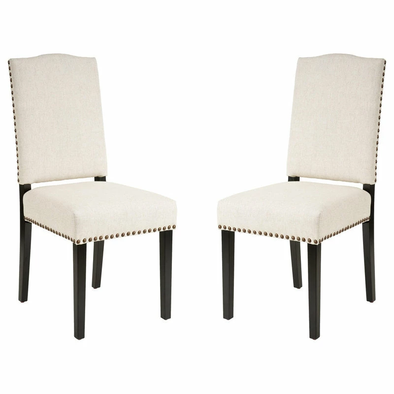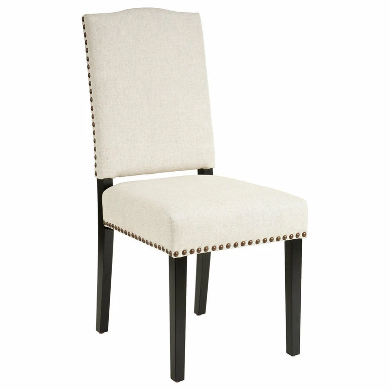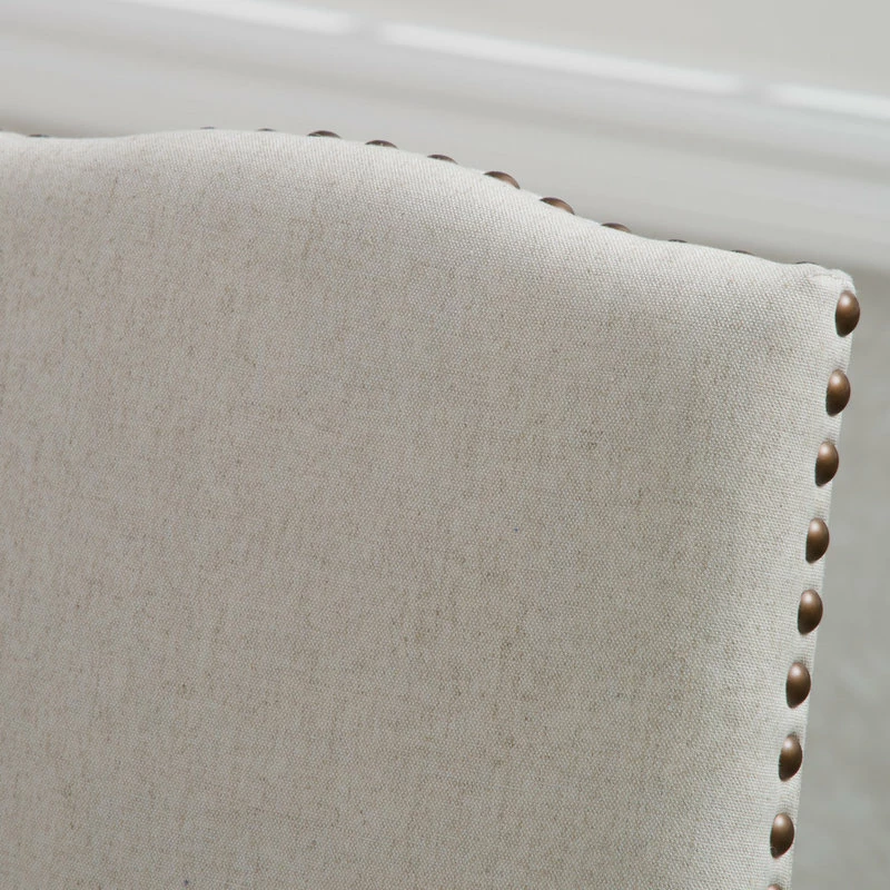 The Stuart dining chair is upholstered in fine, soft beige fabric, accentuated with brass nailheads along the perimeter, and stands on espresso stained legs. Stylish and comfortable, you will enjoy having this dining chair in your home.