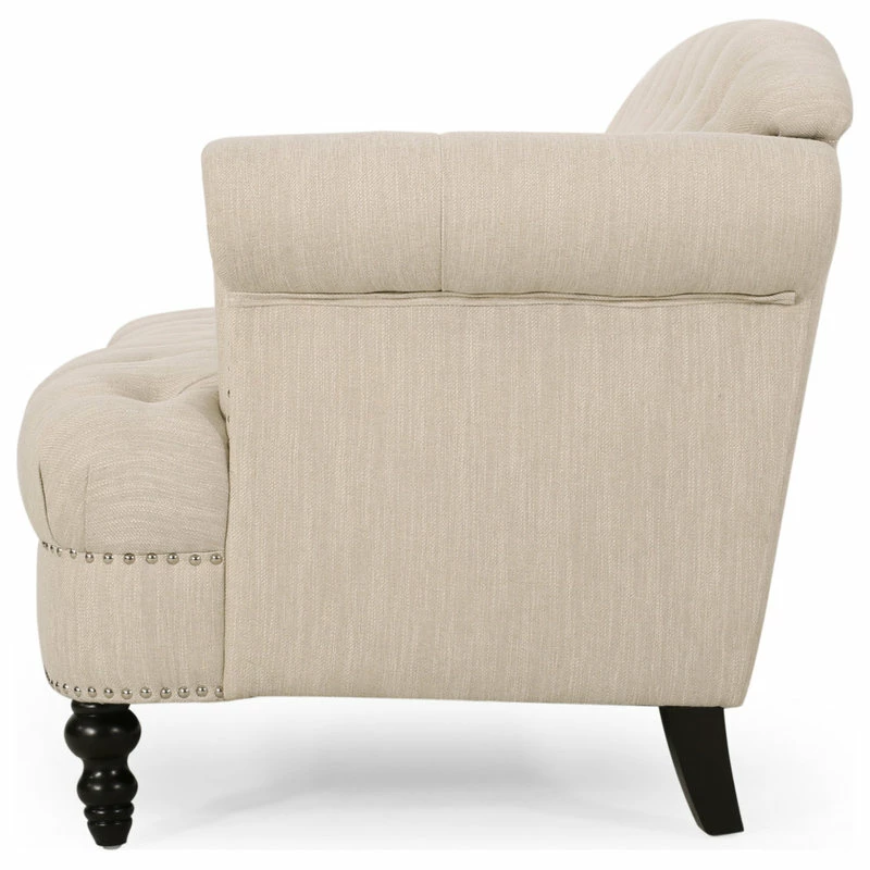 CONTEMPORARY STYLE: With a minimalistic yet refined structure, this set brings out a contemporary style that emphasizes comfort and functionality. This is influenced by traditional Chesterfield elements, hitting all the key elements of deep button tufting, nailhead accents, rolled arms, and turned legs.