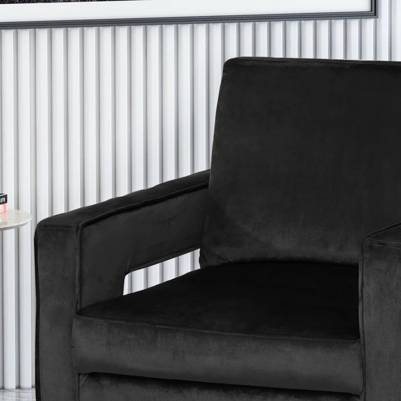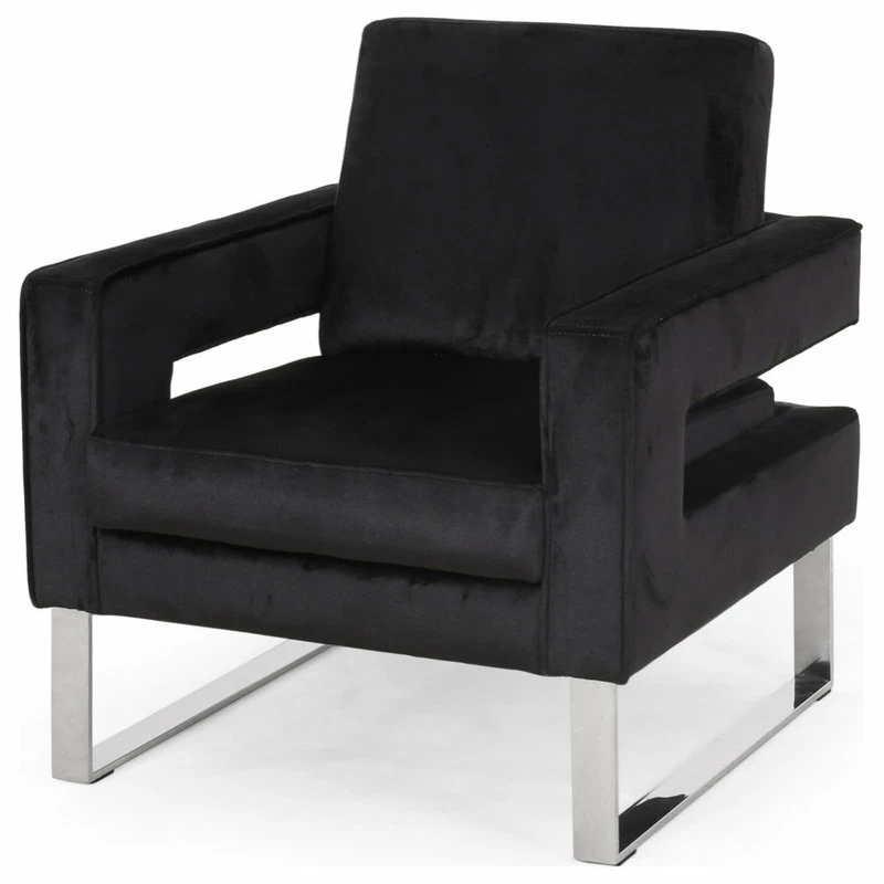 Chic shapes and incredible textures come together to form the ultimate club chair. Our classic club chair takes on a sleek, modern twist to tie your living room together with a flourish. Utilizing soft velvet upholstery and creative use of negative space cut outs, this piece embodies the essence of modern glam style with a precise geometric design. Finished with silver accents, this club chair offers brilliant style and soft textures that make this the perfect addition to any interior space.