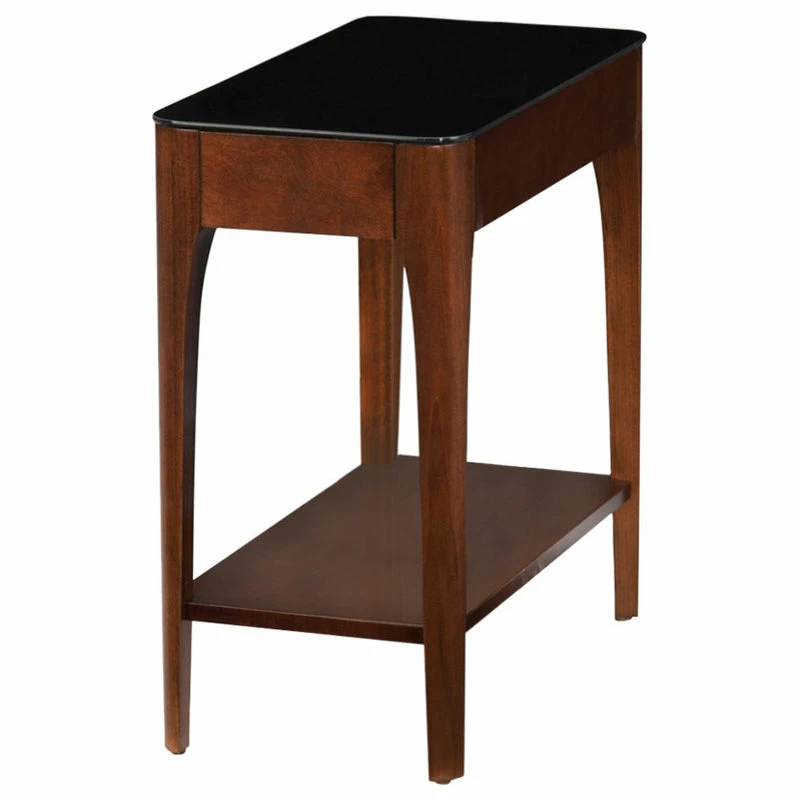 The Obsidian Narrow Chairside Oak Wood Table offers the perfect look for your living room. It boasts streamlined βaeroβ effects like rounded, soft corners, tightly cropped tops and recessed hardware. The thick, black glass table tops glitter with flashing highlights and reflections of home. It features a lower display shelf for storage and is perfectly scaled to fit in most condos/apartments. It comes in a rich, hand applied Chestnut finish and is easy to assemble.