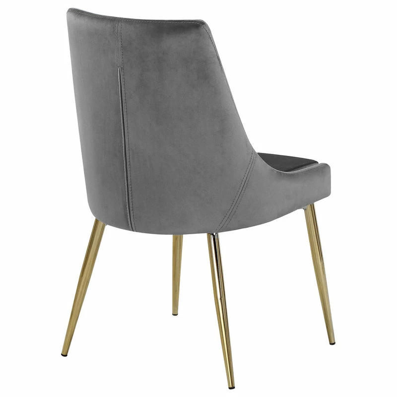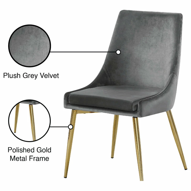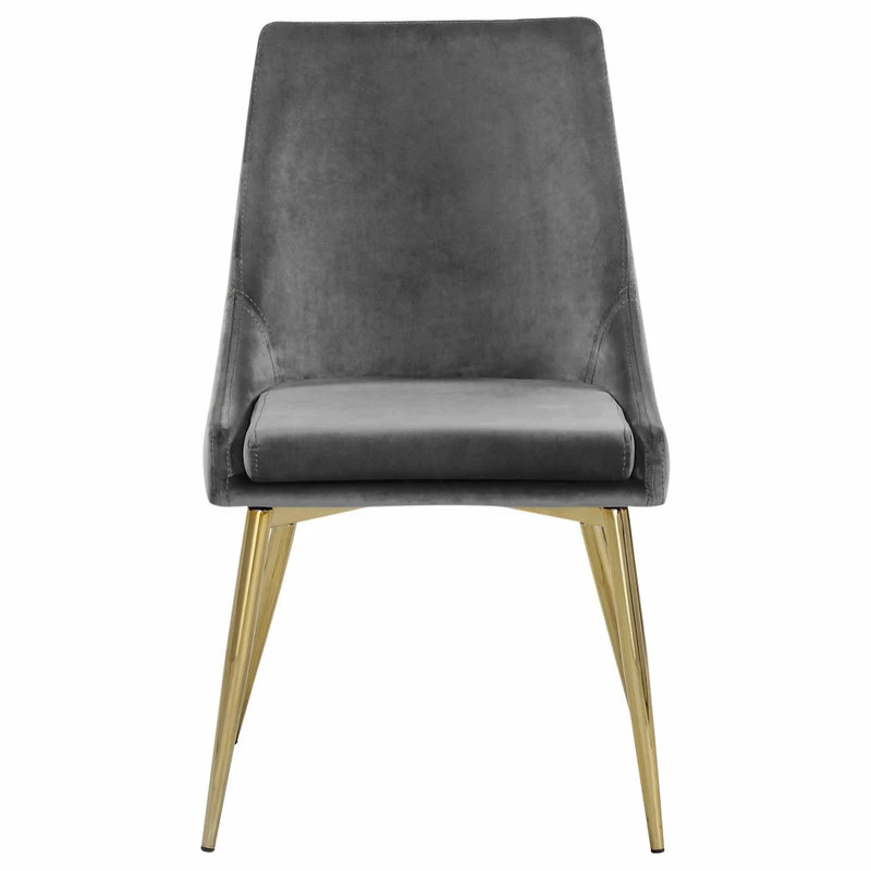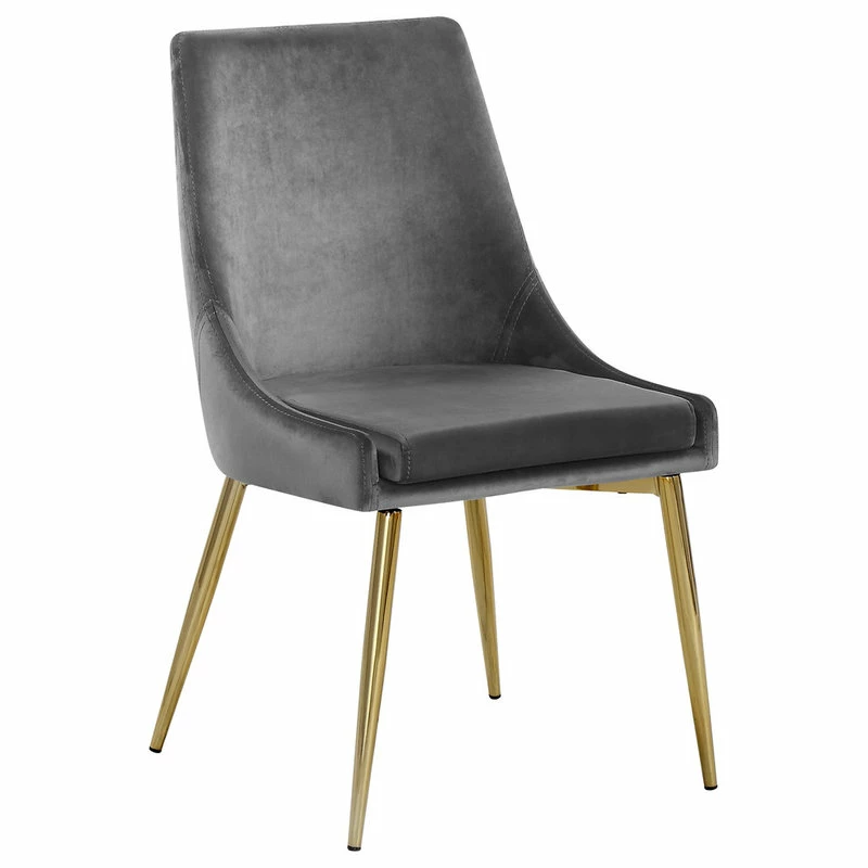Extend contemporary panache to the dining room with this Karina Gray Velvet Dining Chair. This dining chair features upholstery in sleek Gray velvet for a modern look and has an armless design for a retro-inspired vibe. The stark Gray color makes it easy to blend in with your existing decor colors or make a contrasting statement with ease. The slanted legs of this chair are gold finished for added modernity and to provide reliable and durable support while you dine.