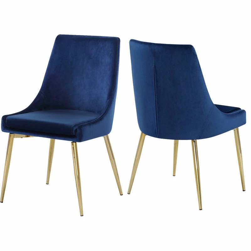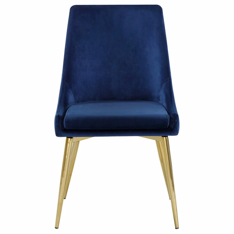 Extend contemporary panache to the dining room with this Karina Navy Velvet Dining Chair. This dining chair features upholstery in sleek navy velvet for a modern look and has an armless design for a retro-inspired vibe. The stark navy color makes it easy to blend in with your existing decor colors or make a contrasting statement with ease. The slanted legs of this chair are gold finished for added modernity and to provide reliable and durable support while you dine.