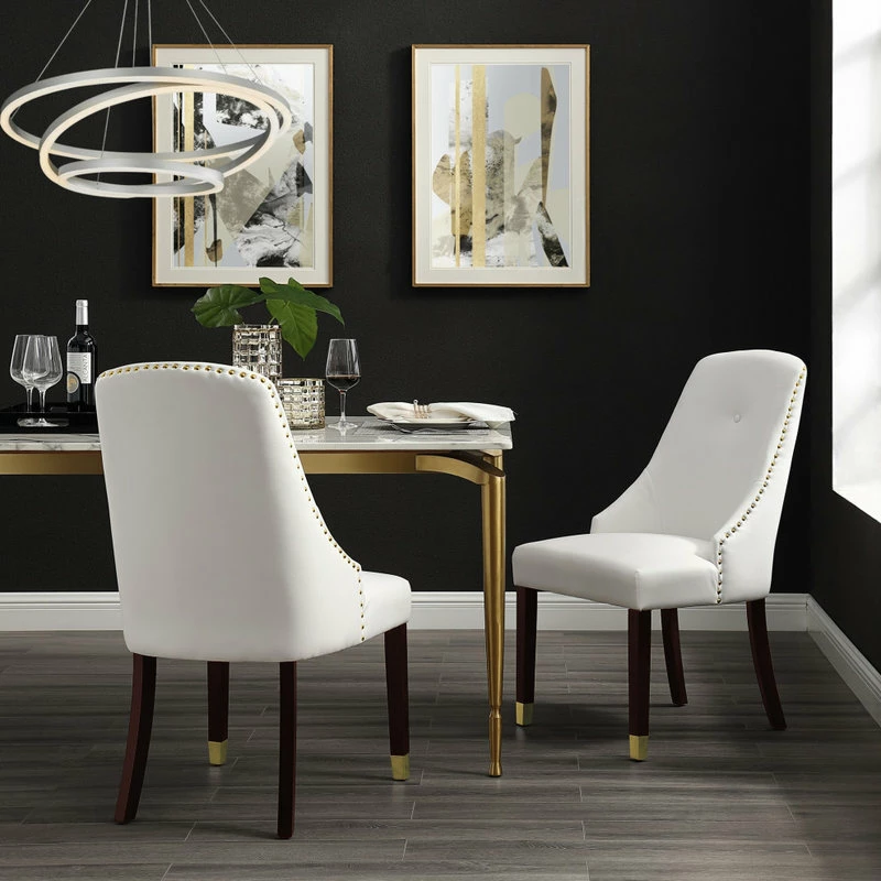 Our trendy dining chairs in set of 2 add stylish intrigue to your dining room and kitchen area. These beautifully upholstered dining chairs create a warm, inviting seating option with a unique style that will add an aura of sophistication to your dining room with its alluring comfort and luxurious style.