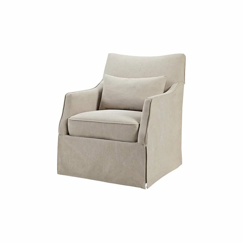 - Farmhouse skirted swivel chair in beige fabric , Seat dimension 22W x 23D x 18.5H, cushion thickness 7 inches, High back for better upper back support, Lumbar pillow included, Solid wood legs in reclaimed wheat finish, Legs assembly required, Wipe with a damp cloth or steam clean