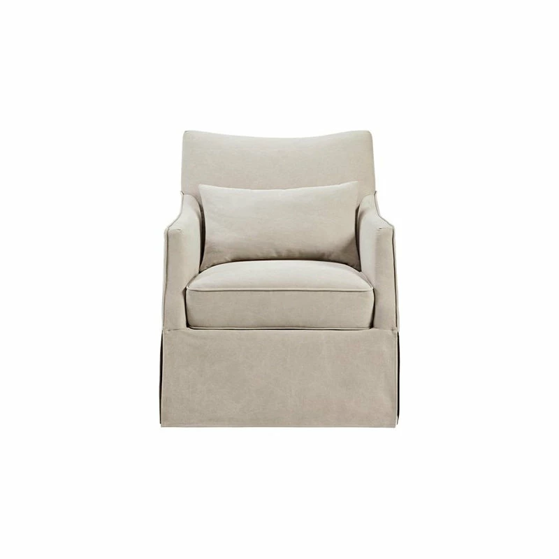 Created exclusively for the Martha Stewart Bedford furniture collection that embodies country farmhouse living, the London Skirted Swivel Chair introduces a simple comfort to your living room decor. This swivel chair is upholstered in a soft beige fabric with a removable seat cushion that provides exceptional comfort. The metal swivel base allows the chair to fully rotate 360 degrees, while the skirted bottom helps conceal it for a transitional look. A lumbar pillow is also included. At her country farmhouse, Martha enjoys bringing the outdoors in. This functional and practical lifestyle is evidenced in her thoughtfully appointed decor which embraces a neutral color palette that acts as a perfect backdrop to four seasons of color. Fully assembled.