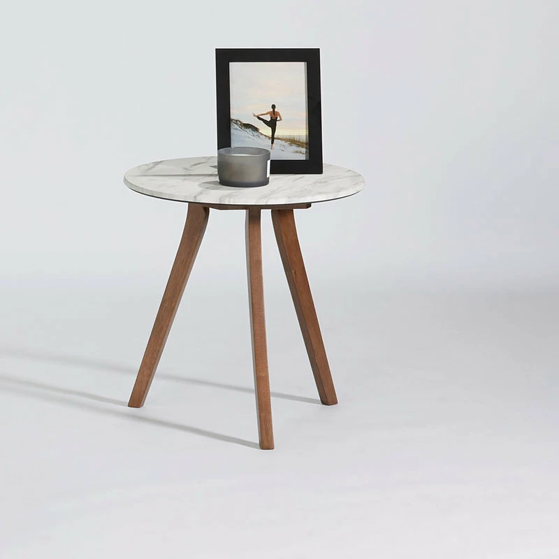 Taking durable to a different level is what these tables are all about. Table tops made from moulded High Pressured Laminate hardboard can take on spills, burns, even hammers. Yes I said hammers and if your household is like most, that doesn’t sound so strange. This round “Pixie” end table is perfect for sectionals or any modern transitional style that calls for clean sophistication. The table top looks and feels like natural white Carrara marble that has a textured feel. Base, including the great splayed modern legs in an easy honey finish perfect for all. Lightweight for easy mobility and compliments perfectly.Domini White table top looks like natural white Carrara marble