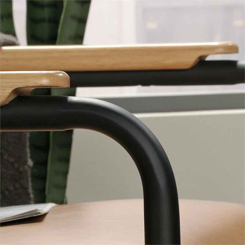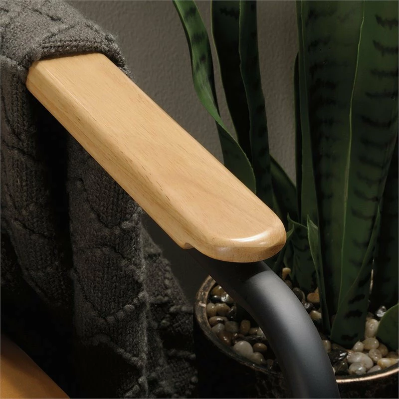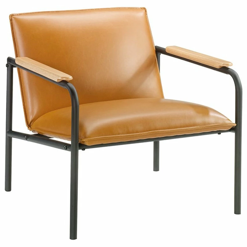 Add sophisticated style and comfort to your home dΓ©cor with this chair from the Boulevard CafΓ© collection. This handsome lounge chair features a leather-like cushioned seat and back for comfort you can enjoy while you sit back and scroll on your smartphone or relax while watching the evening news. Its two armrests are accented with wood arm caps for an extra touch of elegant style that is sure to catch the eye of all your guests. Attractive from every angle, this mid-century inspired accent chair is the perfect accent no matter where it stands β living room, dining room or office! With its unique Camel color and durable, powder coated black metal frame, this classy chair gives your home dΓ©cor the wow factor that you have been looking for. This item is for residential use only.