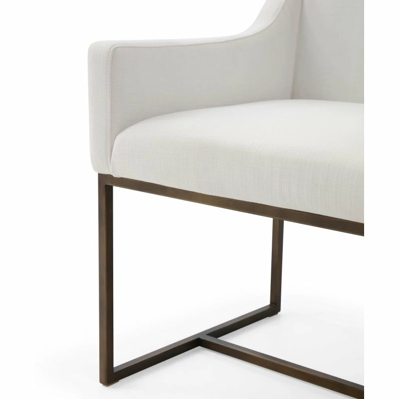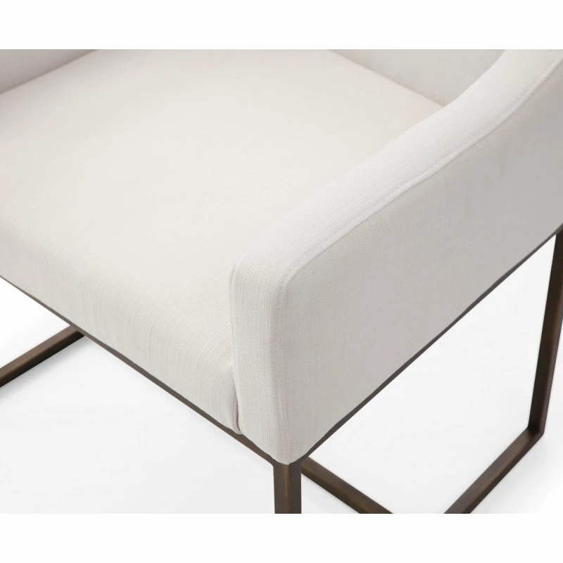 The Elijah Dining Chair is a beautiful modern contemporary piece of furniture. The squared slope arms match height perfectly with the low back of the chair, creating a fully embracing silhouette. Upholstered in a soft off white fabric, this chair is comfortable and stylish. The antique brass finished legs have modern lines and contrast the soft fabric. These versatile chairs can be paired with any style and look right at home.